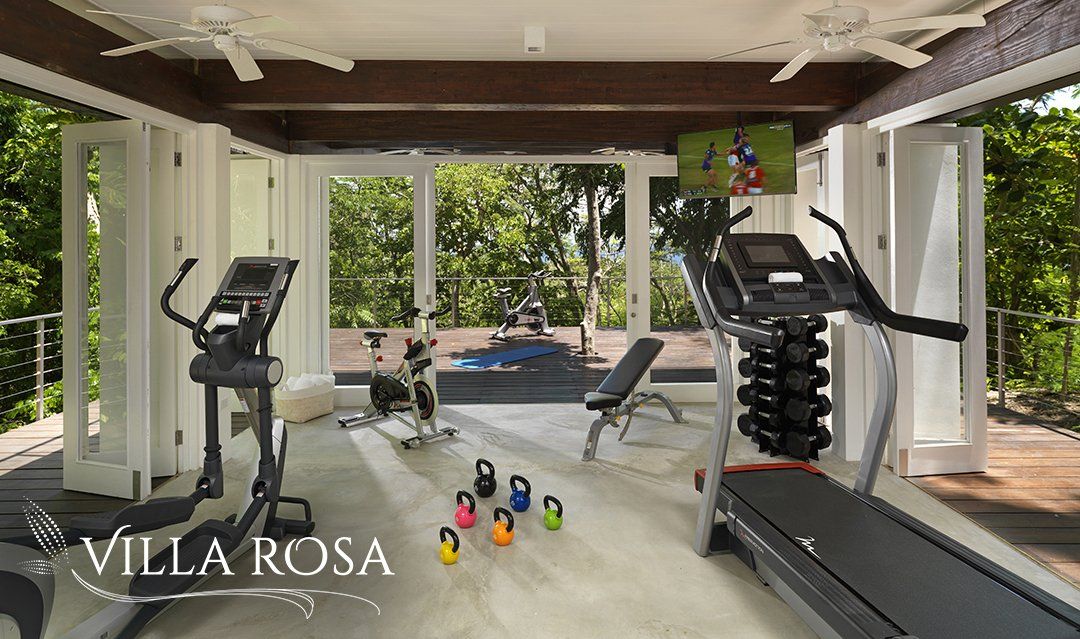 The lower floor houses the gym, equipped with an elliptical and treadmill, 2 spinning bikes, weight bench, kettle bells, VTX weights, yoga mats, 50” TV and a shower. Let the tropical breeze and lush greenery around you give you motivation to get your physical goals to the next level.